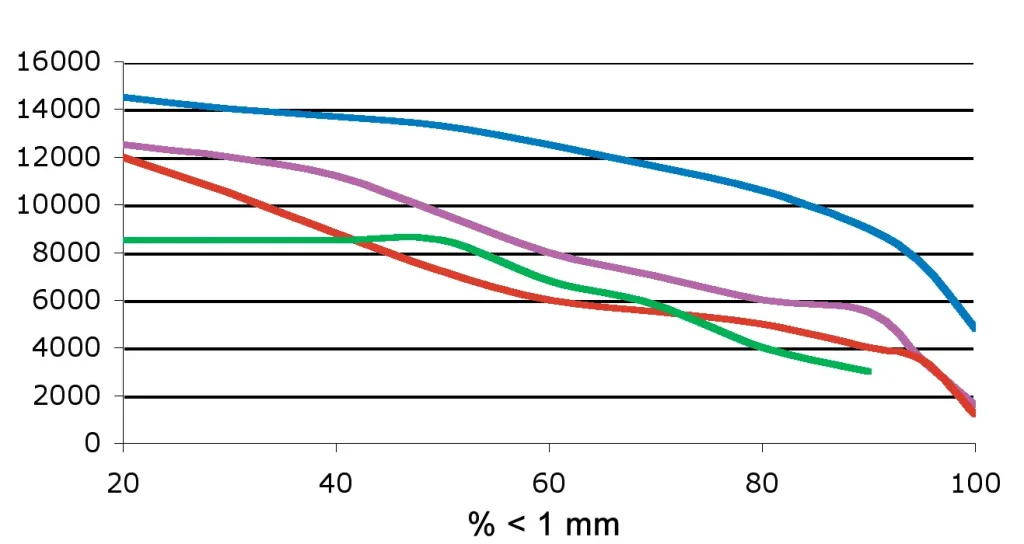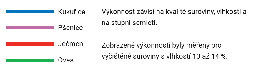 Výkonnost se liší podle druhu suroviny, její vlhkosti a požadovaného stupně semletí.