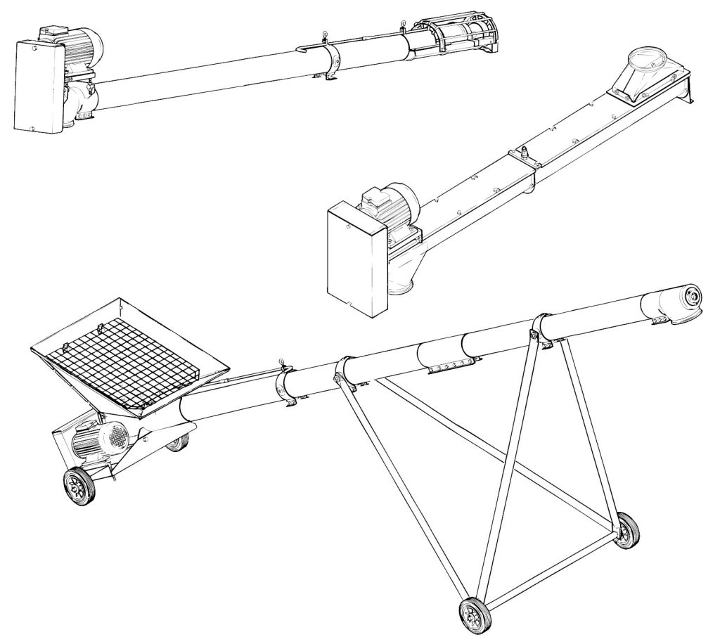 Při určování potřebné výkonnosti motoru je třeba počítat s tím, že výše uvedené délky jsou celkové délky šnekového dopravníku, tedy včetně hlavového složení a vstupní sekce. Pro všechny modely DGA a pro DTS 205 s pohonem klínovými řemeny jsou určené patkové motory B3 s 1.500 ot/min, které se montují na desku v hlavovém složení.