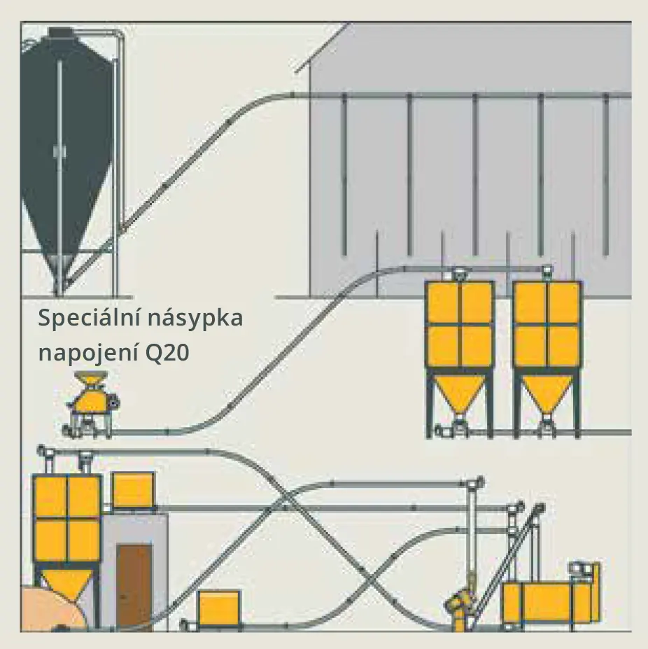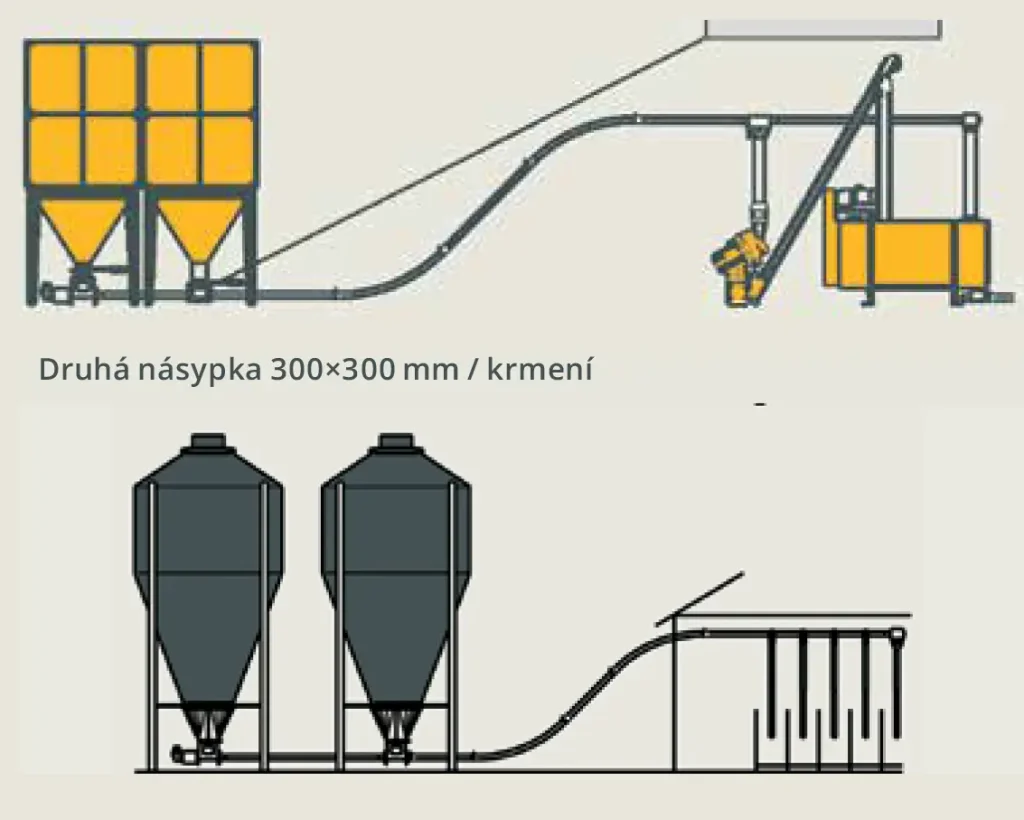 Druhou násypku lze použít bez snížení výkonnosti tam, kde jsou požadovány dva vstupy do jednoho dopravníku. Protože toto řešení využívá 100 % kapacity šnekového dopravníku, jsou zde určitá omezení pro jeho nasazení: celková délka dopravníku může být maximálně 20 m, druhá násypka může být od první násypky vzdálená nejvýše 3 m a dopravník nelze použít pro minerální/vitamínové premixy a další komponenty s měrnou hmotností vyšší než 750 kg/m3.