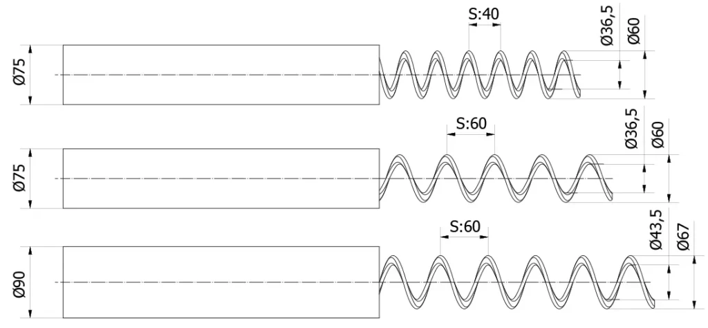 Spirála o průměru 75 mm je dostupná ve dvojím provedení, lišícím se stoupáním. Spirálu s menším stoupáním lze použít pro dopravu minerálních/vitamínových premixů nebo rybí moučky, případně pokud je nutné snížit výkonnost dopravníku.